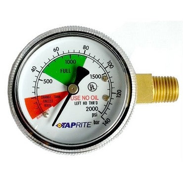 This Taprite gauge is intended to be used with Taprite regulators. It measures the output pressure between 0-2000 PSI. The inlet is 1/4" NPT and is left-hand threaded.